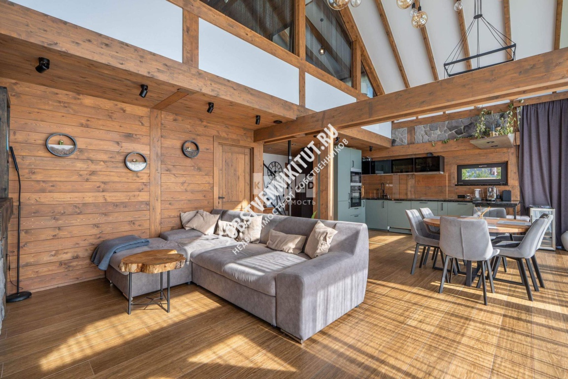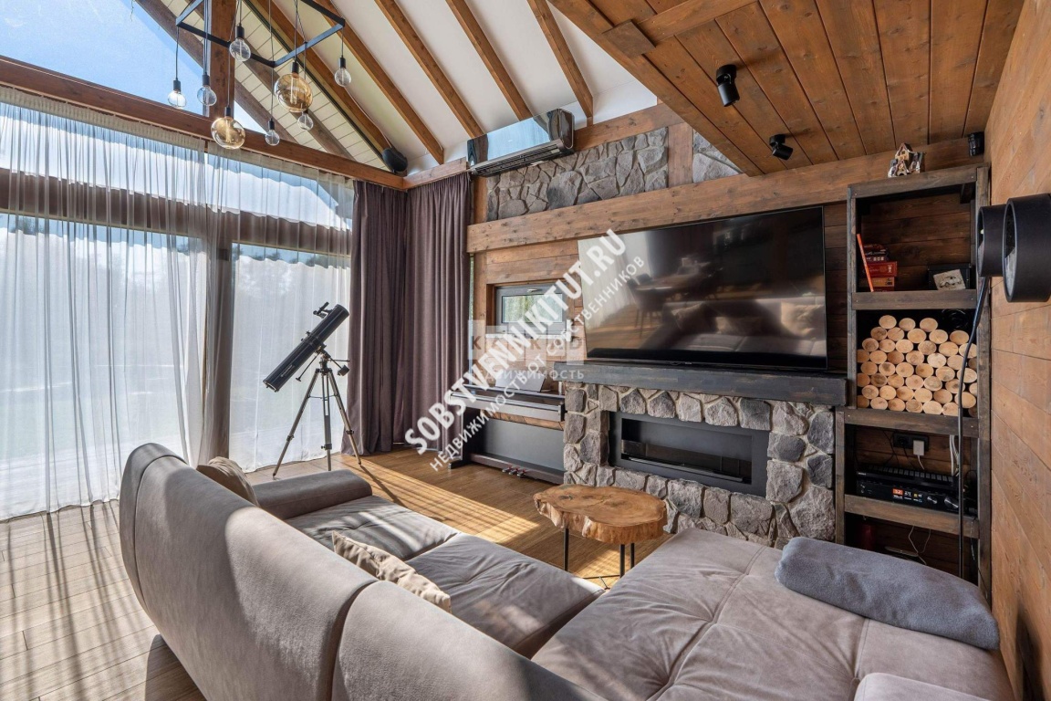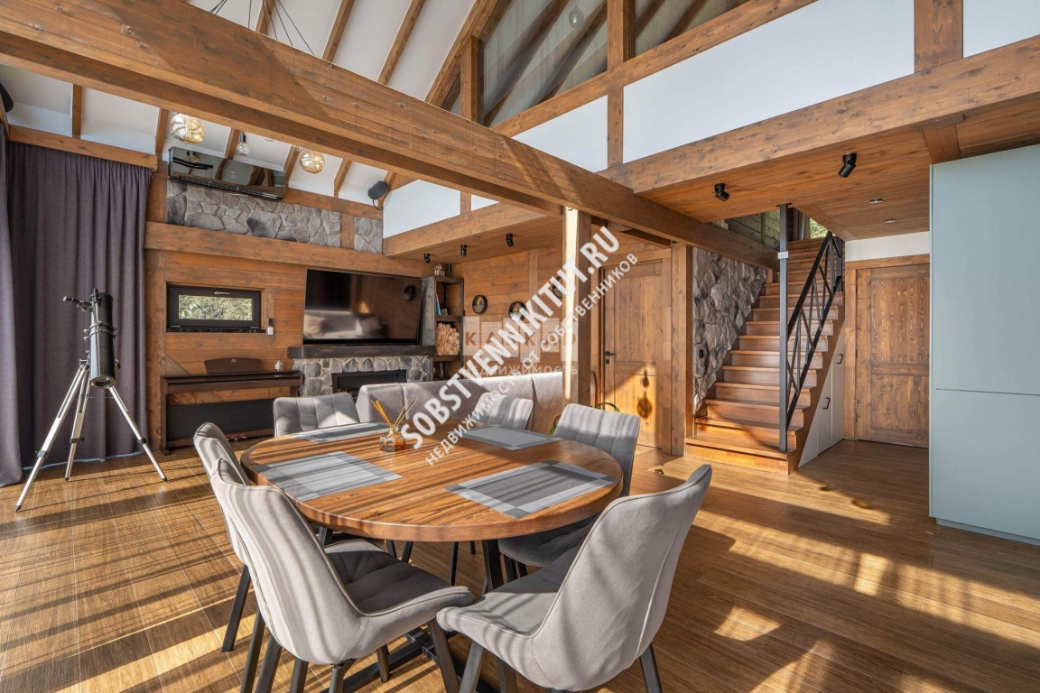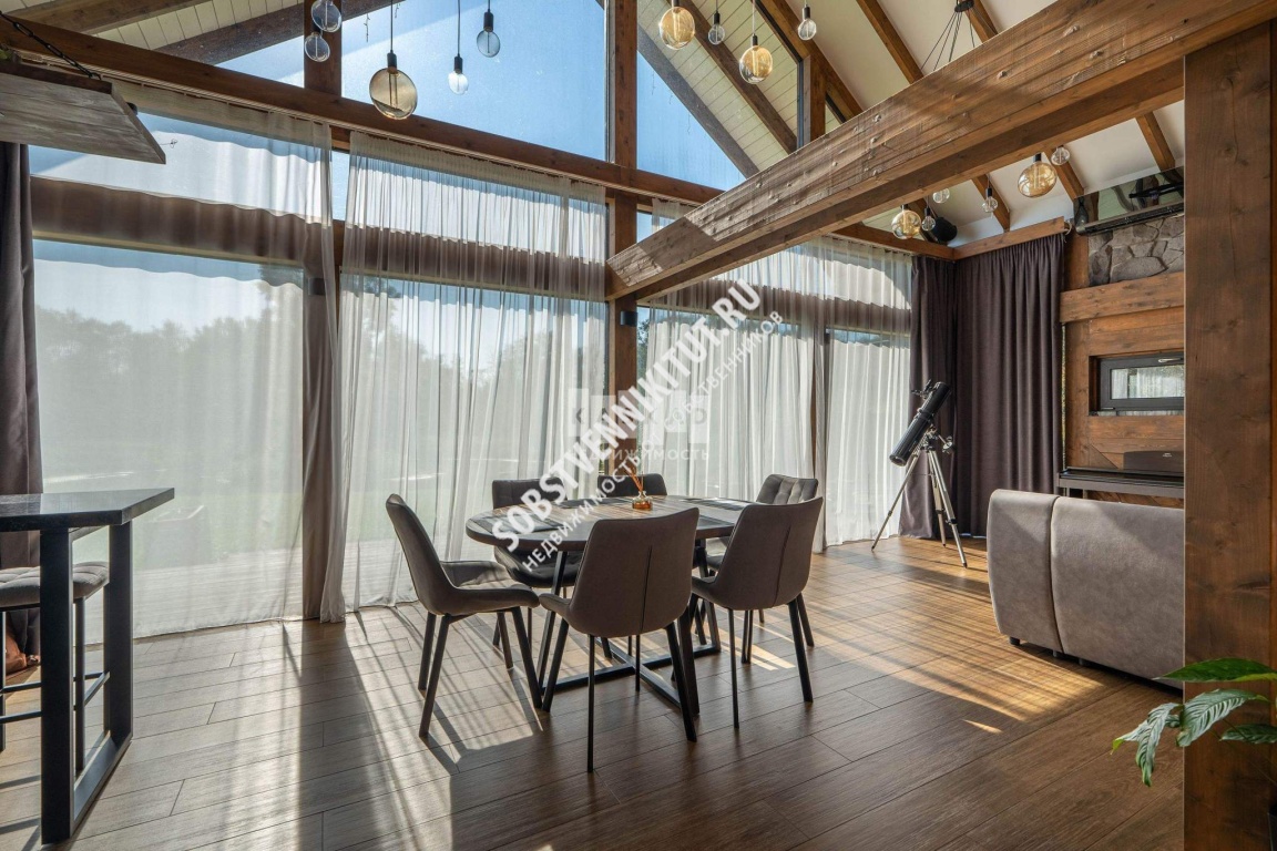 Сердцем дома является просторная гостиная с каминном, со вторым светом и панорамным остеклением, открывающим захватывающий вид на озеро. Продолжением гостиной служит летняя терраса, это идеальное место для отдыха на свежем воздухе и проведения времени с семьей и друзьями.