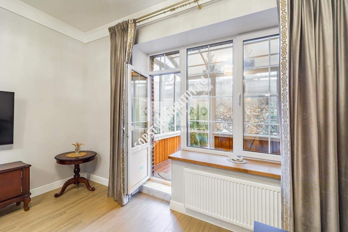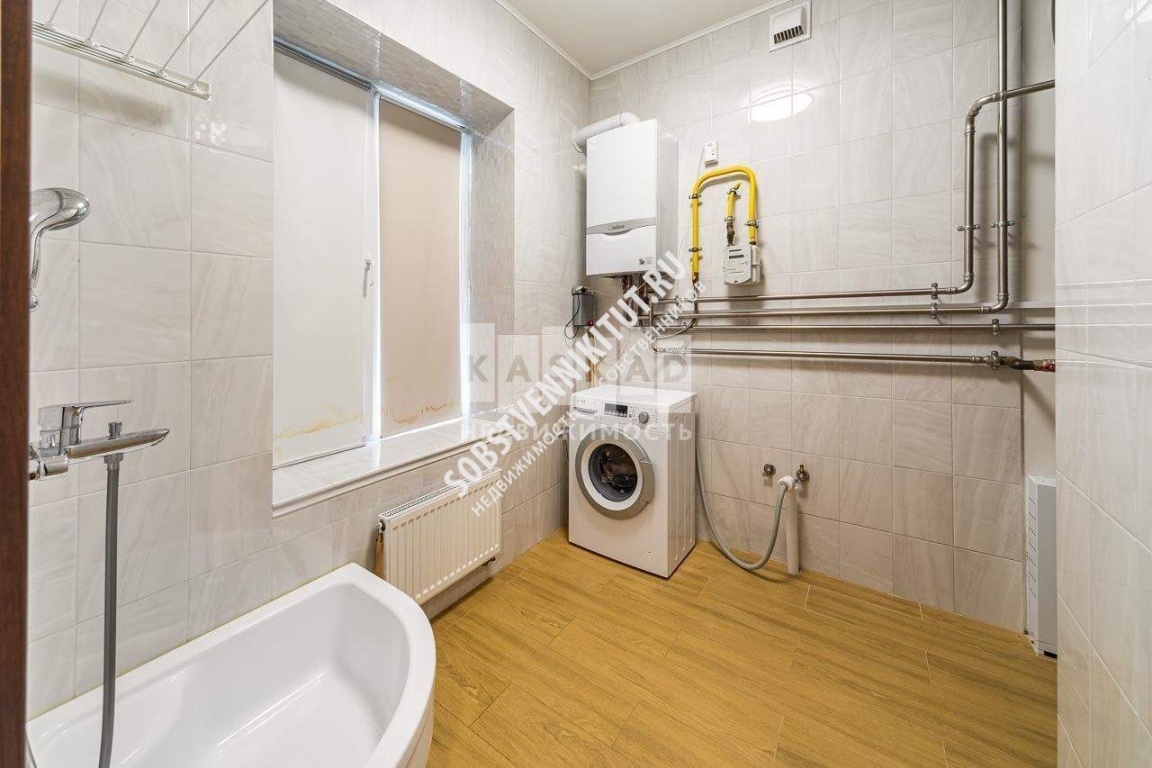 1-й этаж: широкая прихожая, постирочная с дополнительной нишей-кладовкой для хозяйственных принадлежностей, санузел, большая кухня-столовая и гостиная с выходном на просторную застекленную террасу с полом из лиственницы и свой небольшой, но очень уютный участок, на котором можно отдыхать и или собираться с семьёй или друзьями для совместного отдыха. Особенностью участка является его абсолютная приватность (сбоку высокие туи, спереди красивый сплошной забор отделанный искусственным камнем, участок выложен керамической плиткой) .