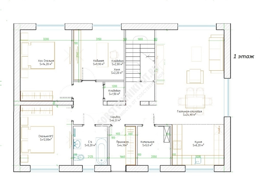 1 этаж: Просторная кухня-гостиная 33,1 кв.м с окнами на три стороны света и панорамной дверью на крытую террасу; три комнаты (9,9/12/14,2 кв.м), ванная комната, бойлерная, гардеробная, прихожая.