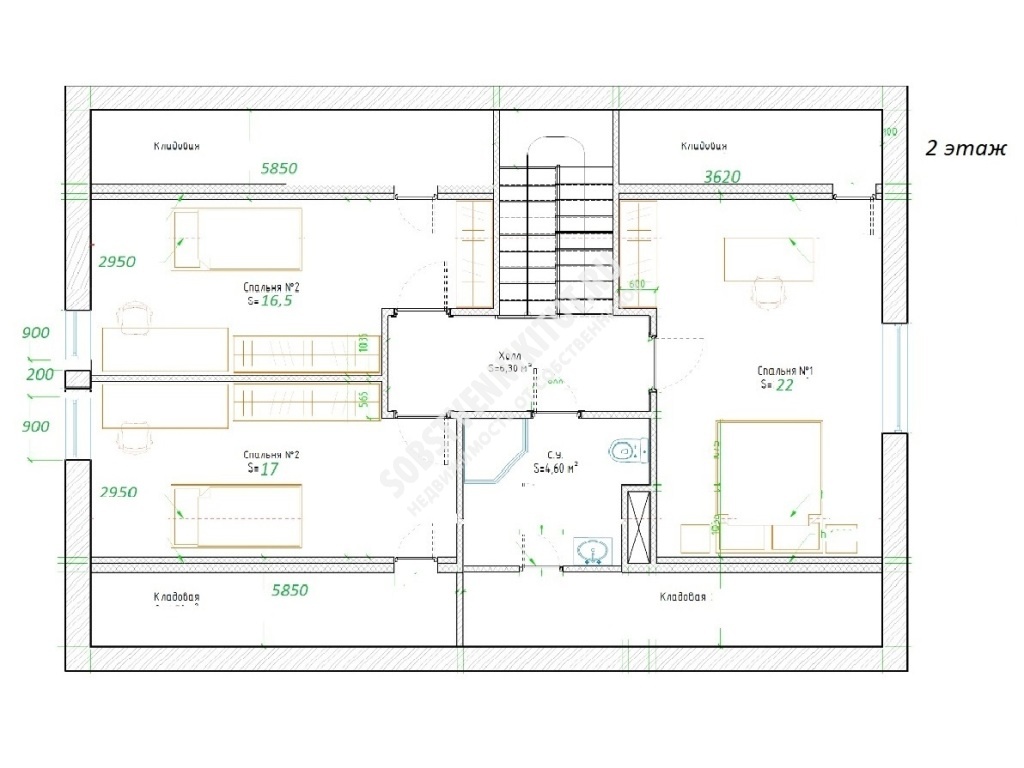 2 этаж: Три спальни (17/16,5/22), с/у с душевой, много мест для хранения.