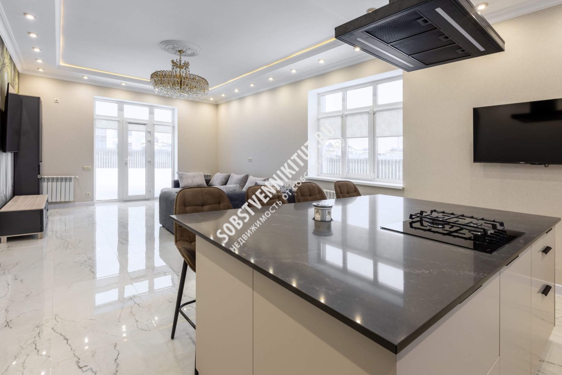 Дом построен в современном стиле. Выполнена отделка "под ключ", установлена встроенная техника, необходимая для постоянного проживания, дизайнерская мебель, каменная столешница и большой кухонный остров, панорамное остекление. В интерьере преобладают четкие линии, правильные формы, а так же обилие света и воздуха. Также во всем доме теплый пол с несколькими контурами отопления, грамотное решение по вентиляционным шахтам, умная электрическая инженерия.