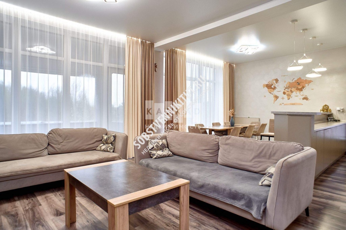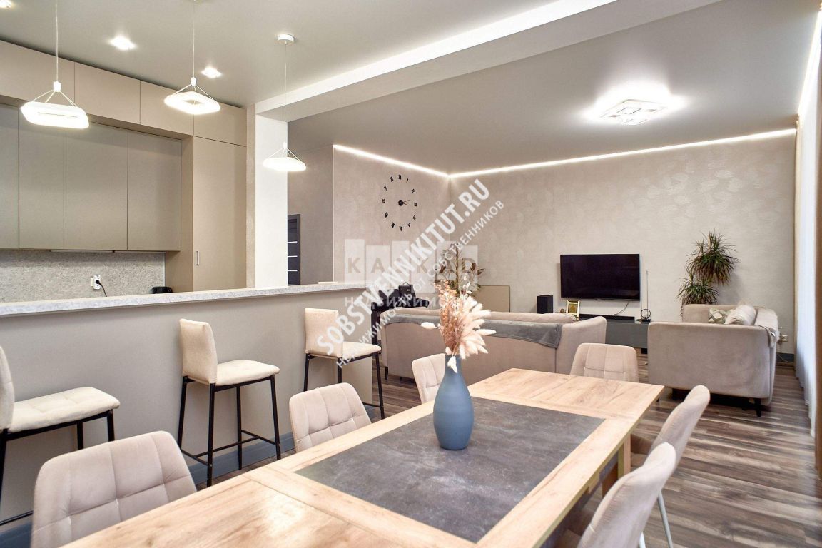 Кухня полностью оборудована встроенной мебелью и современной техникой (холодильник, варочная панель, духовка, посудомоечная машина) .