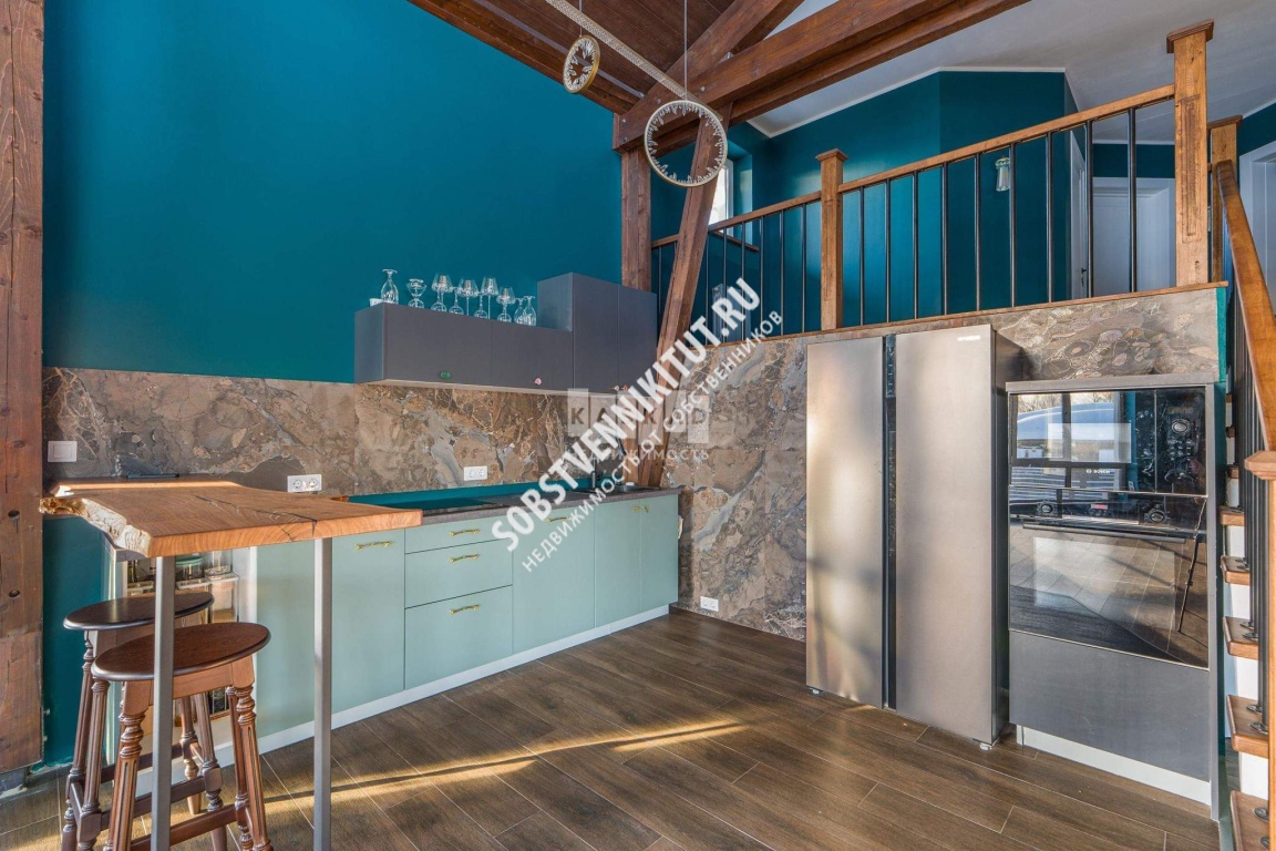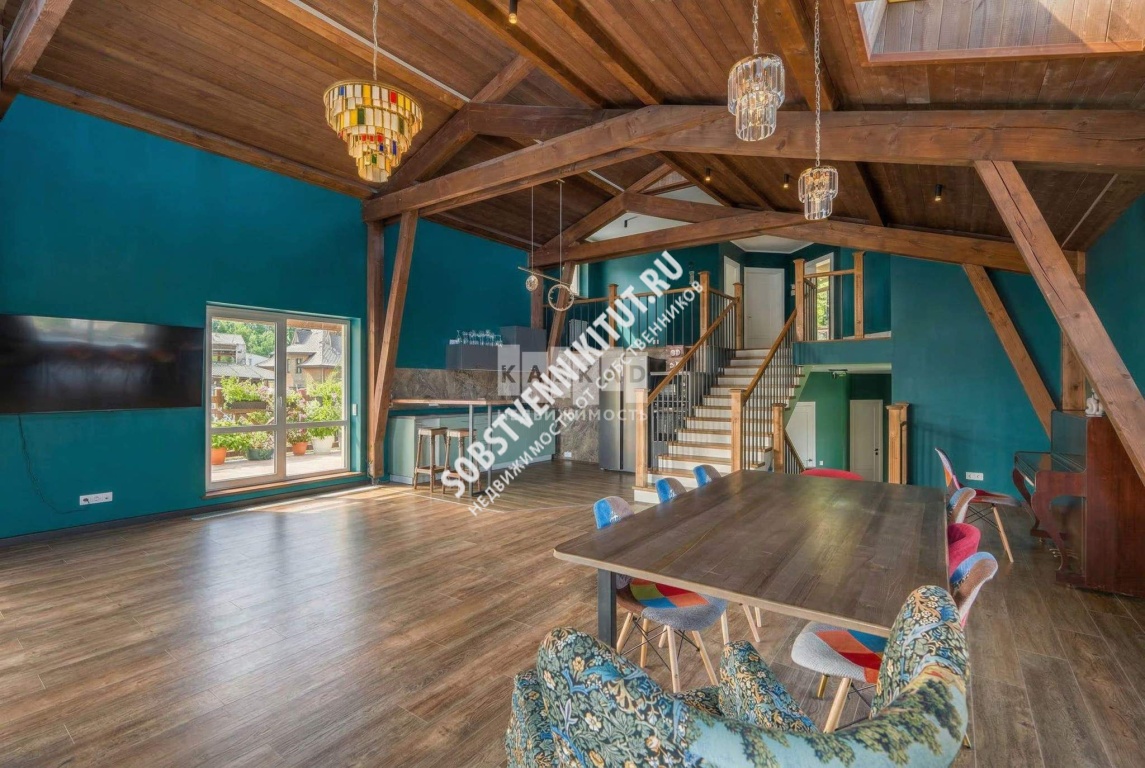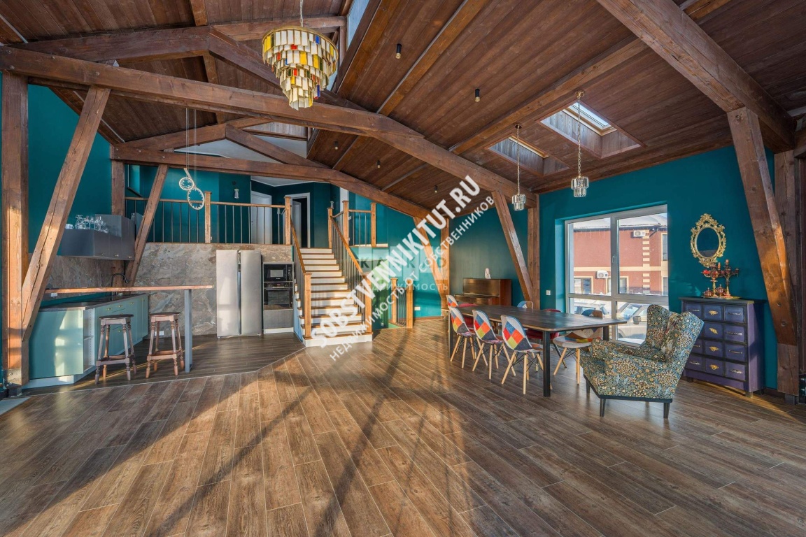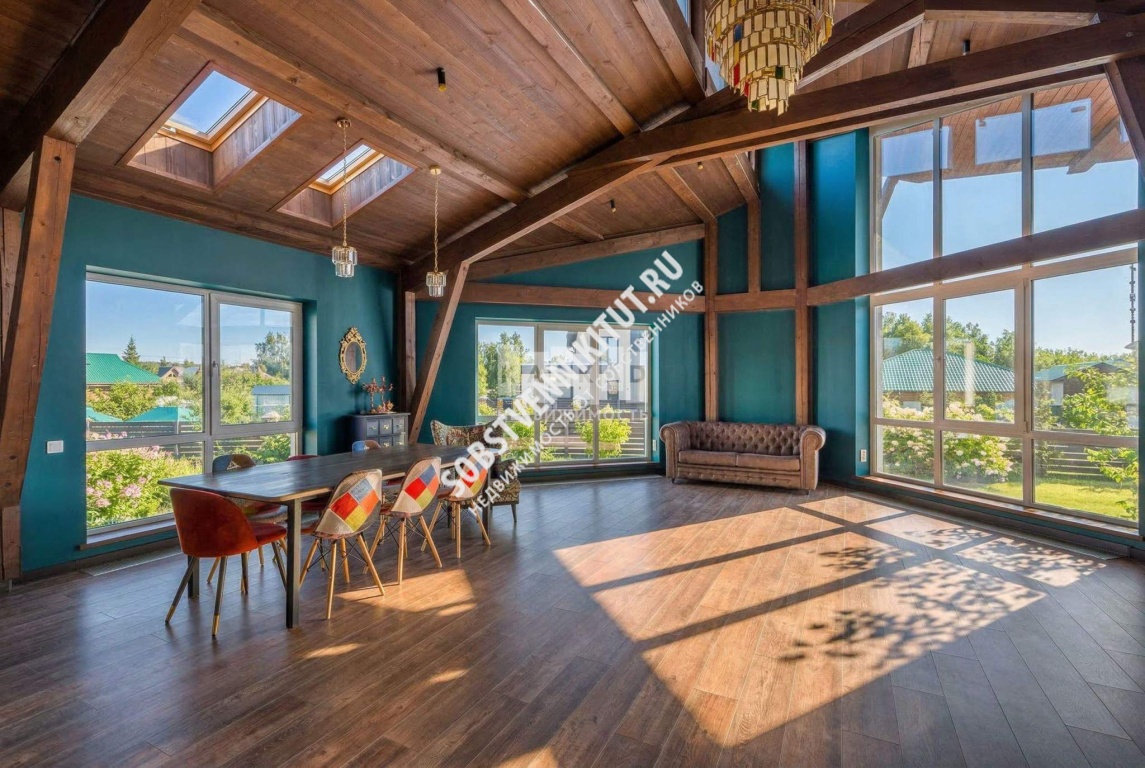 - Гостиная с «вторым светом» 80 м: Высота потолков до 4,5 м, панорамные окна, массивные деревянные балки;
