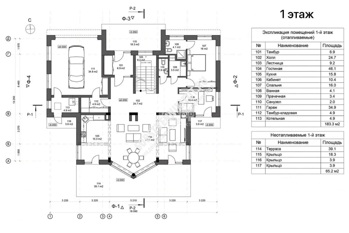 1 этаж: прихожая, кухня - столовая, гостиная со вторым светом, гостевая спальня со своим санузлом, кабинет, гараж на 1 м/м, котельная;