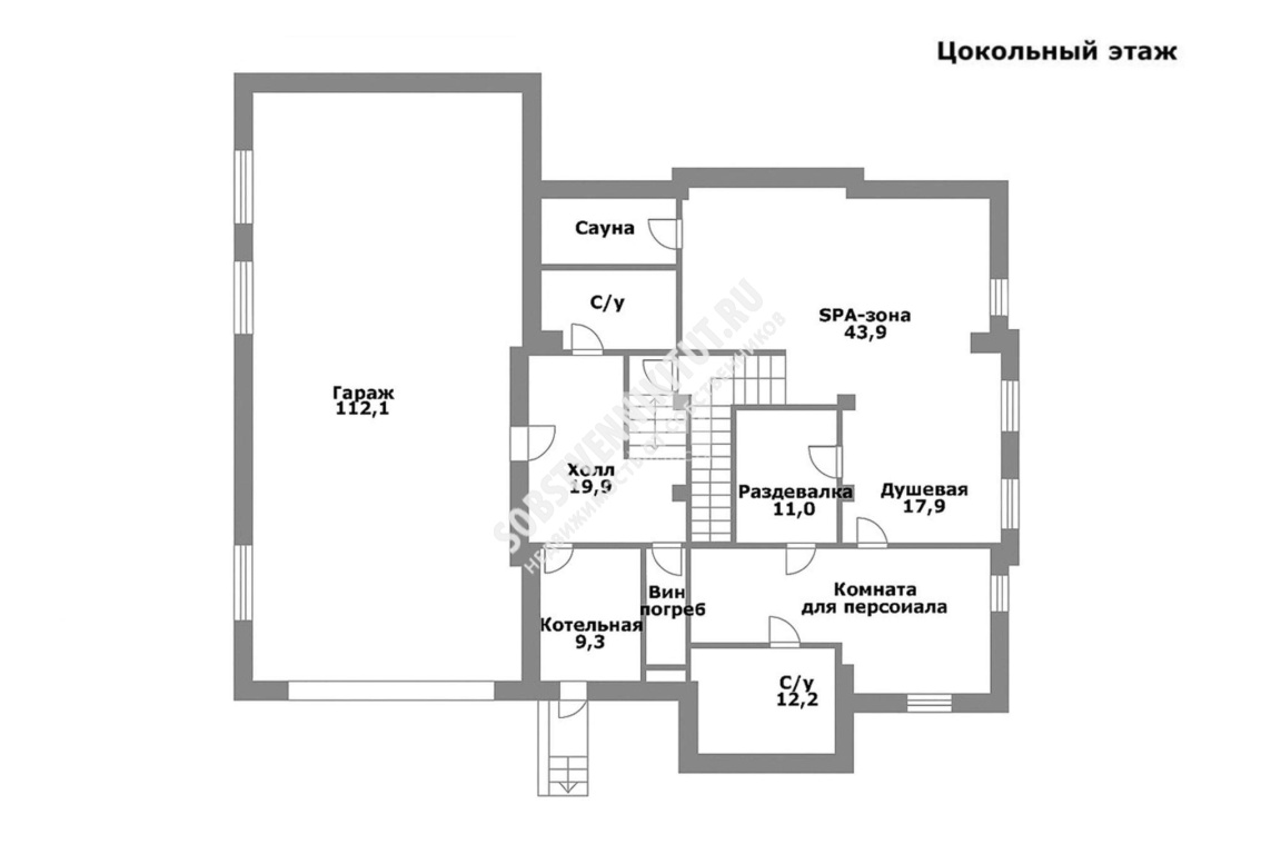 Цокольный этаж: винный погреб, кинотеатр, SPA-зона (джакузи, сауна, душевая), санузел, комната для персонала, гараж на 2 машины место;