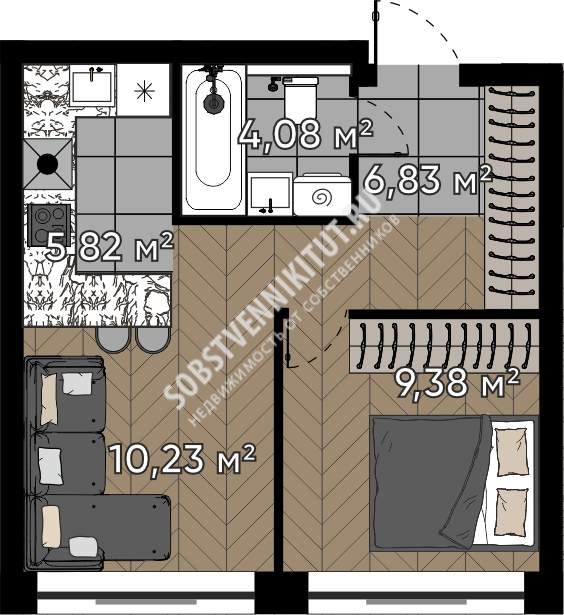Площадь — 36.34/19.61/5.82 м2 общая/жилая/кухня