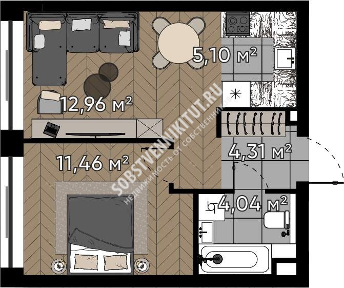 Площадь — 37.87/24.42/5.1 м2 общая/жилая/кухня