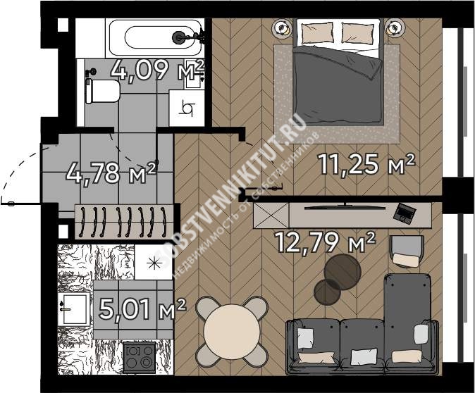 Площадь — 37.92/24.04/5.01 м2 общая/жилая/кухня