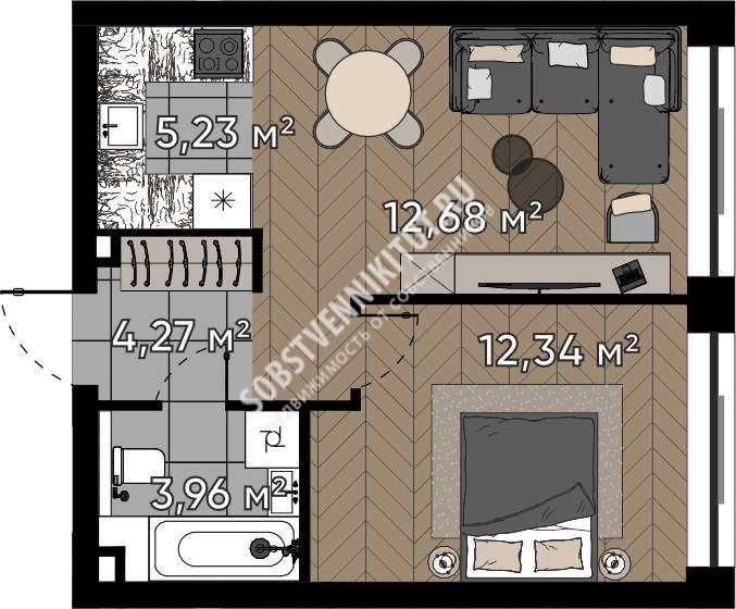 Площадь — 38.48/25.02/5.23 м2 общая/жилая/кухня