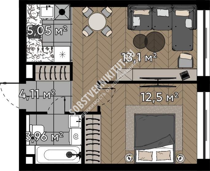 Площадь — 38.72/25.6/5.05 м2 общая/жилая/кухня