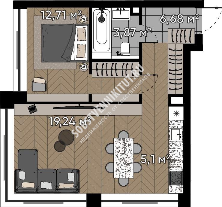 Площадь — 47.6/31.95/5.1 м2 общая/жилая/кухня