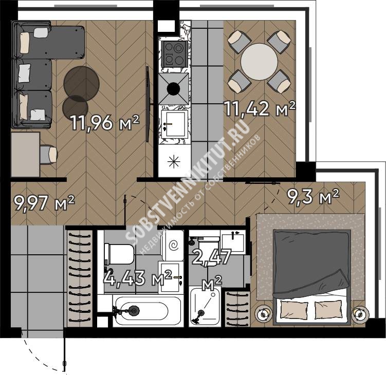 Площадь — 49.55/21.26/11.42 м2 общая/жилая/кухня