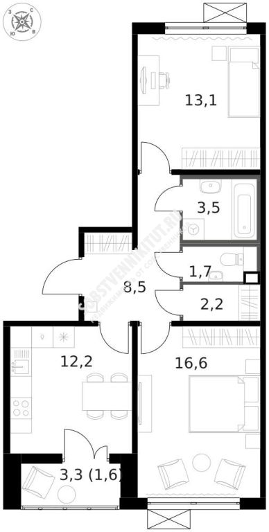 Площадь — 59.4/29.7/12.2 м2 общая/жилая/кухня