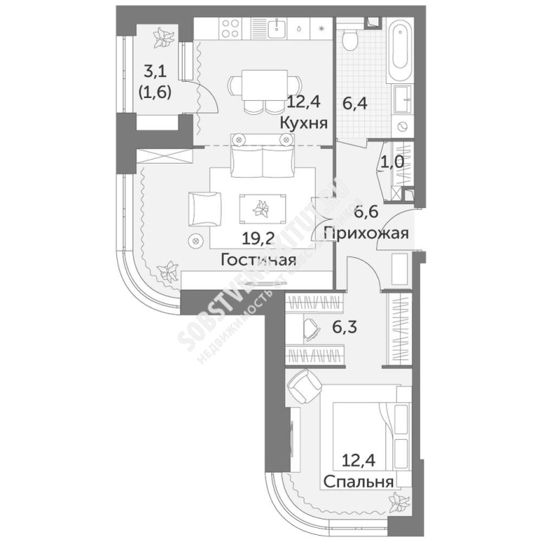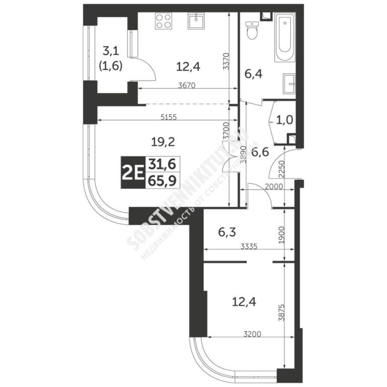Площадь — 65.9/31.6/12.4 м2 общая/жилая/кухня