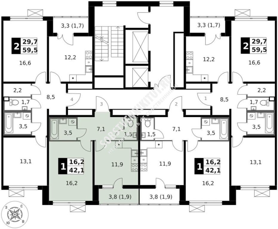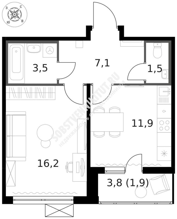 Площадь — 42.1/16.2/11.9 м2 общая/жилая/кухня