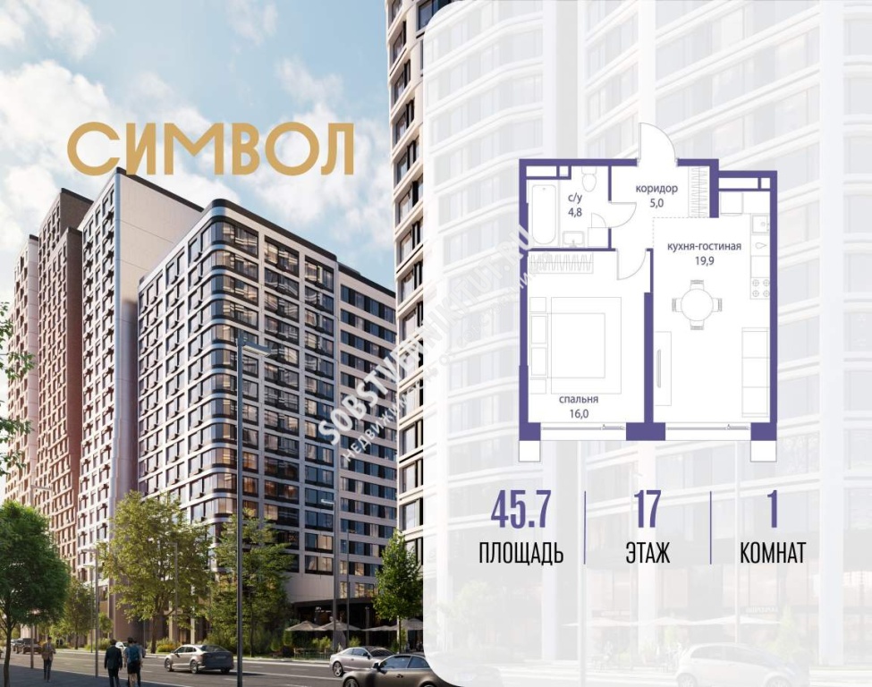 Продается 1-комнатная квартира от застройщика: общая площадь 45.70 м, жилая 16.00 м, кухня 19.90 м, 17-й этаж, жилой квартал «Гордость», корпус 36 (секция 3) . Срок сдачи: 2 квартал 2029 года.