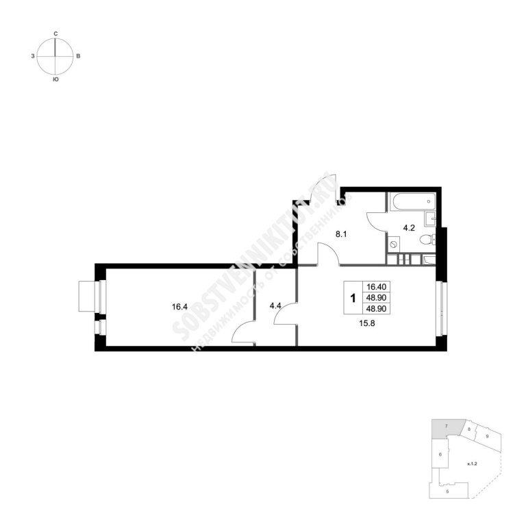 Площадь — 48.9/16.4/15.8 м2 общая/жилая/кухня