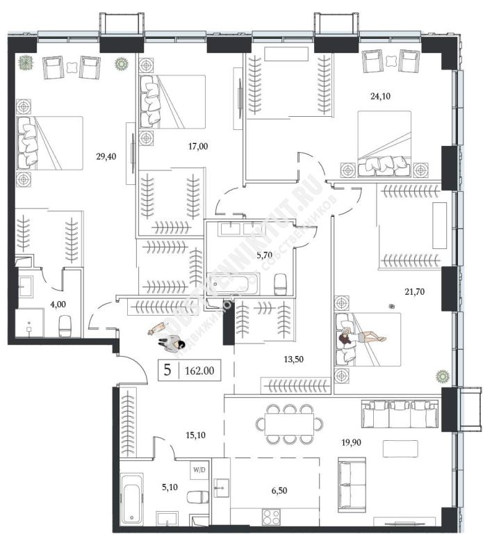 Площадь — 162/113.4/24.3 м2 общая/жилая/кухня