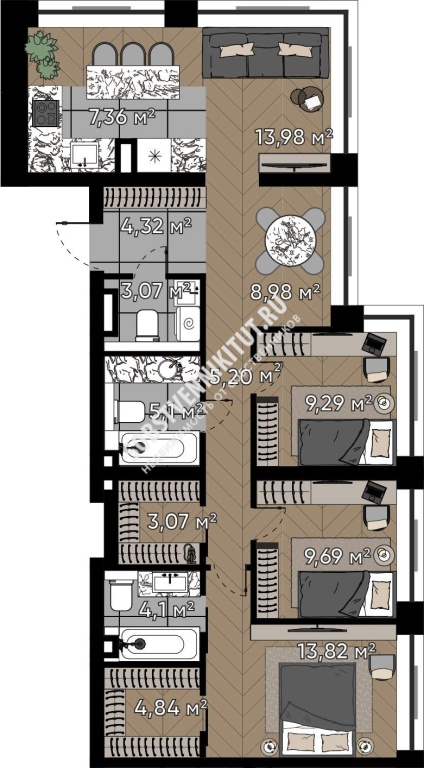 Площадь — 92.82/55.76/7.36 м2 общая/жилая/кухня
