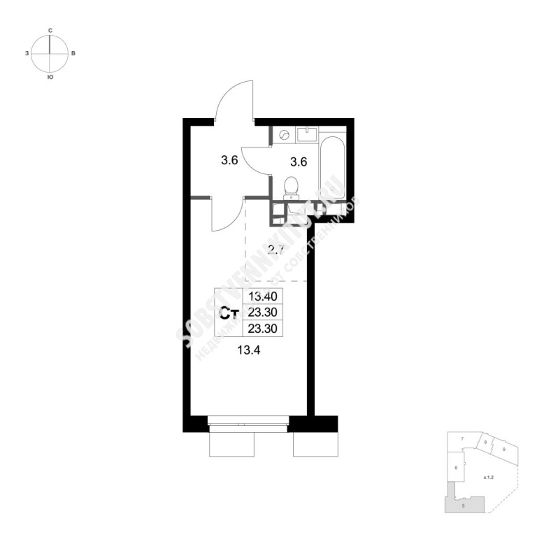 Площадь — 23.3/13.4/2.7 м2 общая/жилая/кухня