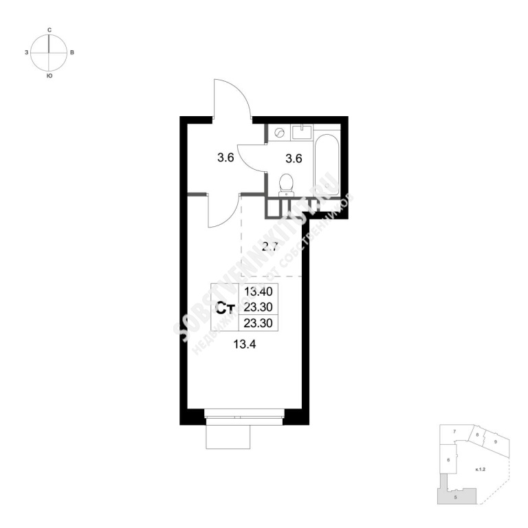 Площадь — 23.3/13.4/2.7 м2 общая/жилая/кухня