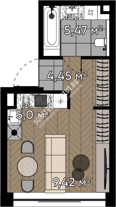 Площадь — 24.34/9.42/5 м2 общая/жилая/кухня