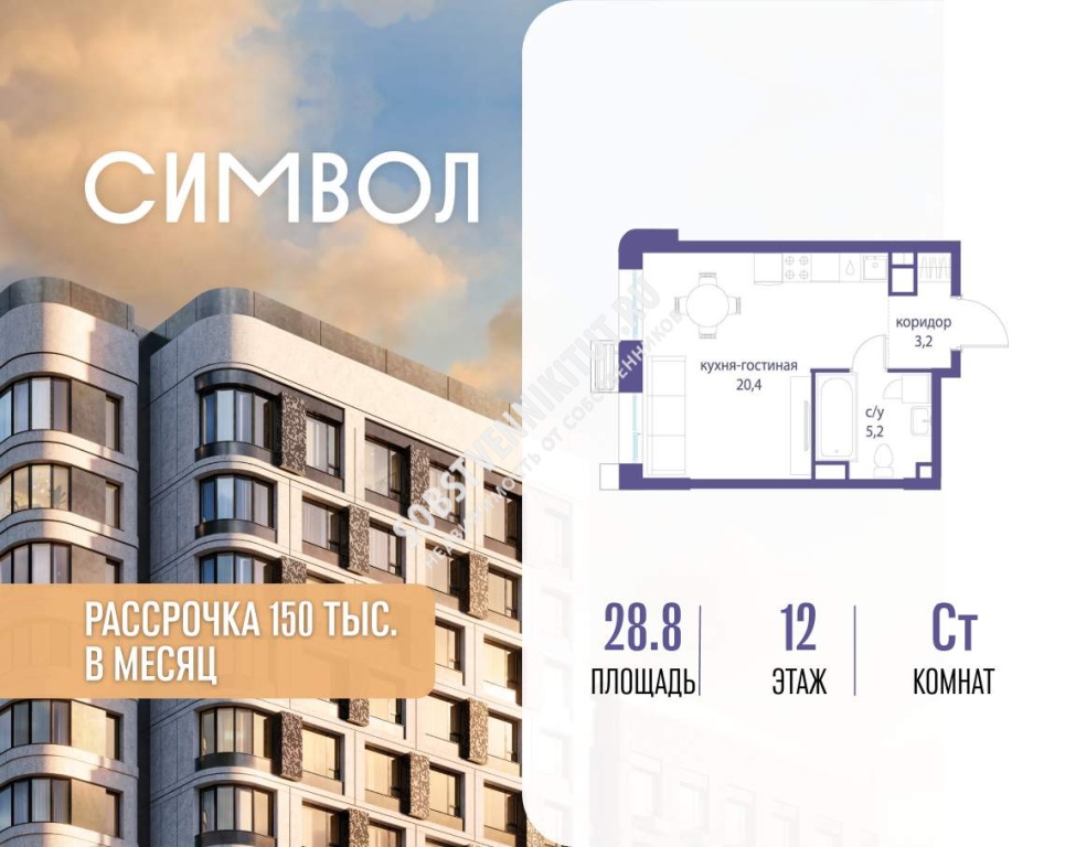Продается квартира-студия от застройщика: общая площадь 28.80 м, жилая 10.00 м, кухня 10.40 м, 12-й этаж, жилой квартал «Гордость», корпус 36 (секция 5) . Срок сдачи: 2 квартал 2029 года.