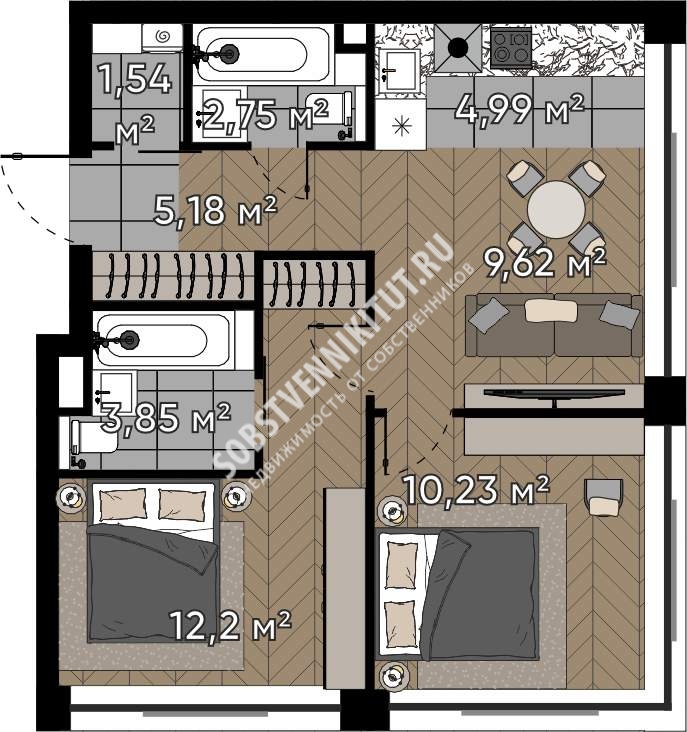 Площадь — 50.36/32.05/4.99 м2 общая/жилая/кухня
