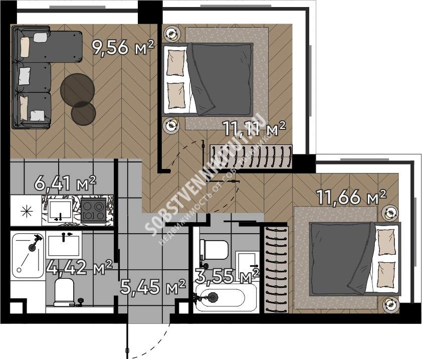 Площадь — 52.16/32.33/6.41 м2 общая/жилая/кухня