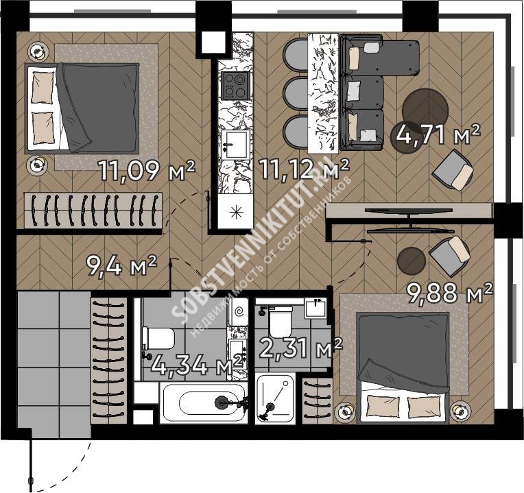 Площадь — 52.85/25.68/11.12 м2 общая/жилая/кухня