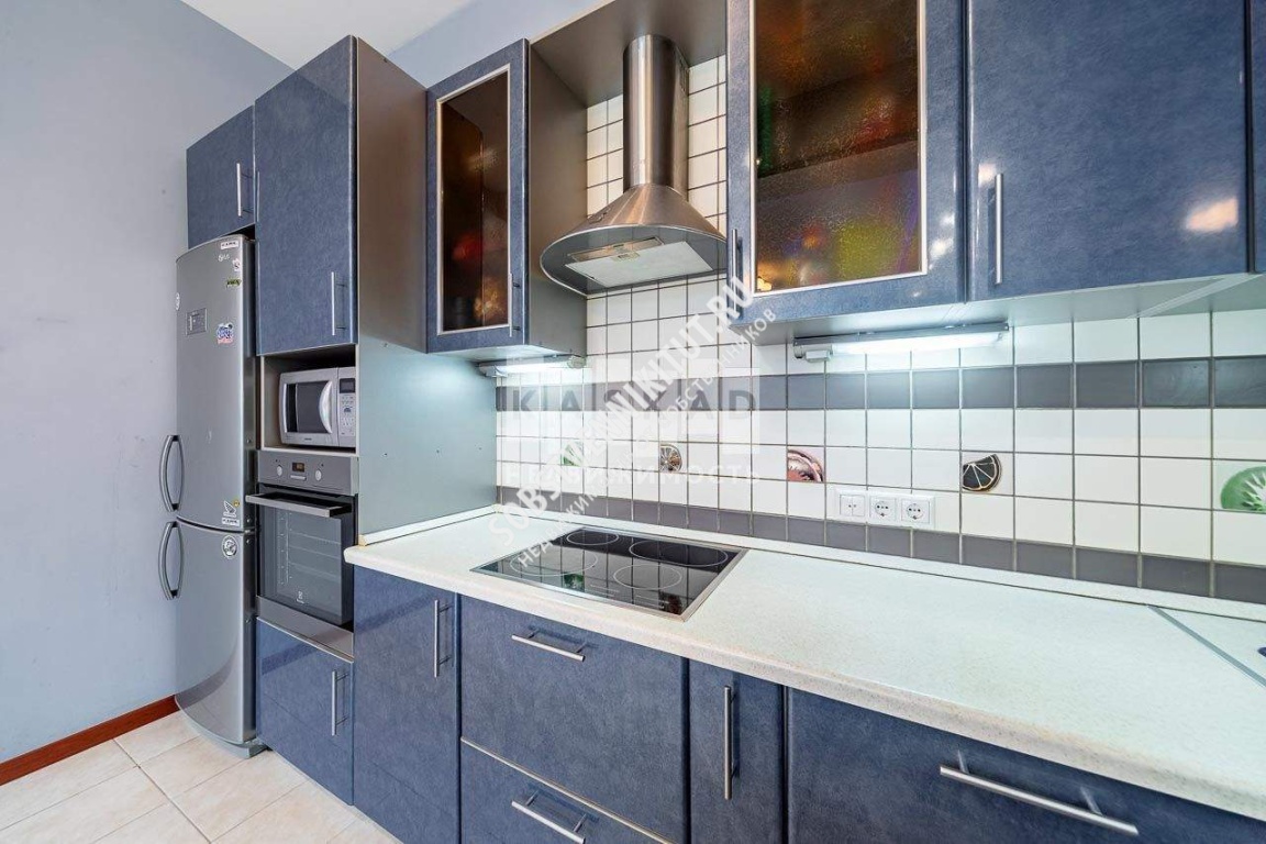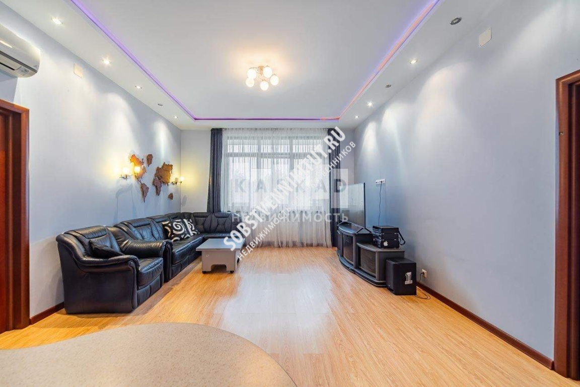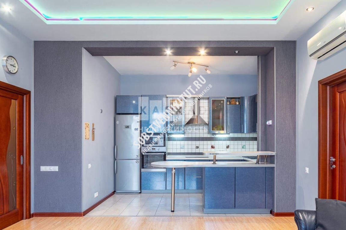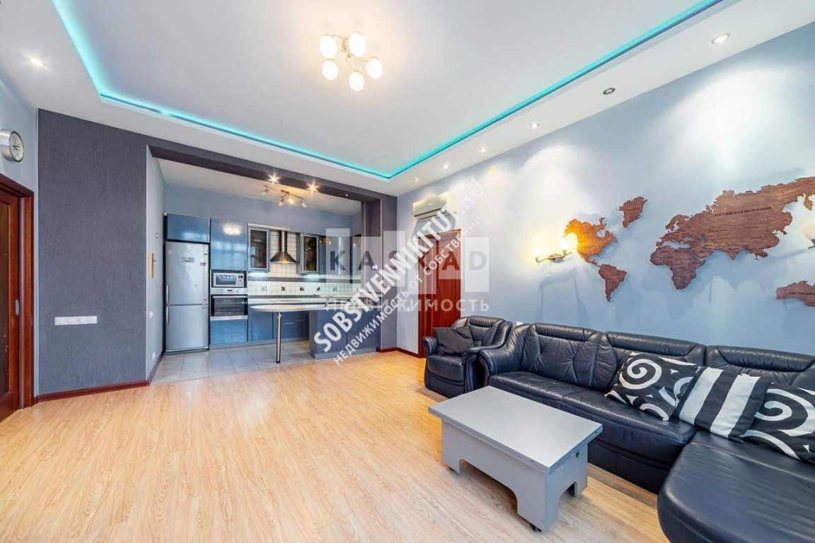 кухня + гостиная комната (встроенная кухня с барной стойкой совмещена с просторной гостиной. Помещение оснащено кондиционером, множеством вариантами освещения, 3 больших окна, с обеих сторон есть двери);