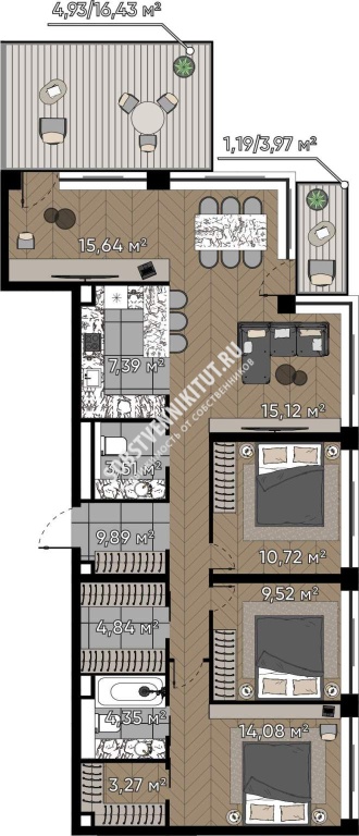 Площадь — 108.52/65.08/7.39 м2 общая/жилая/кухня